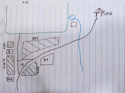因为在外地生活了许久,李子杰对自己的家乡了解已经不算太深,只能暂时回忆起村子的大概布局以及农田方位。他把自己能记住的画了一张图,让其他两人能知道大概布局。