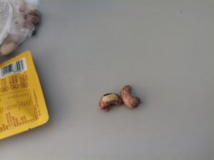 两颗大腰果 一颗有皮,另一颗的皮有点残缺 还挺大的,跟我的小拇指前三个指关节差不多 皮上的花纹很像花生的颜色,斑斑点点的棕又像老人班 背上有条缝,如虾米一样蜷曲着 凹陷进去的那一面还有两个凸起,一个大一个小,大的在大头上,小的则不太明显。用侧面拿起来看的话,又有点像萨满教的巫师,又有点像中世纪的防毒面具;用正面拿起来的话像眼镜蛇,又有点像公鸡的鸡冠和脖子下面的连缀,最上面的头还像老鹰和豹子的结合。