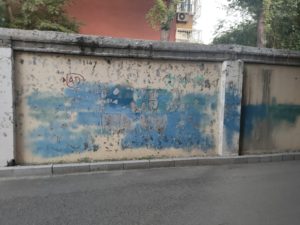 - 它处在一个默默无闻之处,这里不热闹,路过的人不多,即使路过了也不一定会注意这里。也处在阴影之中,一年四季,或许这里终年不见阳光。看上去它十分突兀,因为它不是一面整洁、漂亮的强,称得上杂乱,但同样也是它最显眼,它赋予了它所在的环境的特殊性,如果没有它,这个环境会变得很普通
