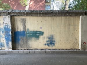 - 凌乱的痕迹,有毫无章法的蓝色喷漆,没有被撕干净的报纸,人为用喷漆和粉笔写上的字、画的画,墙面裂开的纹理,泥污。我摸到了粉笔灰,触感很扎手,很干燥,很粗糙,摸得到裂纹和风干后凸起的泥点,还有报纸碎片和蜘蛛网。真的什么味道也没有它没有声音,但是靠近它的时候耳边的其他声音会变得模糊。当我敲击它时,它发出微弱的、闷闷的响声,可以听出墙是实心的,但是我不能太用劲敲,因为手会很痛