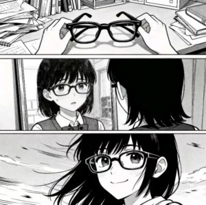 第二天清晨,阿笠早早站在镜子前,穿着整洁的白领。她从旧抽屉里取出姐姐给她准备的0度数黑框眼镜,那看起来和姐姐的一模一样。她伸手给自己带上,抬头看着镜子里的自己,愣住了。