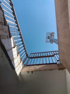 曲折向上,灰色的把手上有些锈迹,原本刷的白漆有很多裂纹,裂纹周围是泥土的颜色,又的地方还有一些裂开的苔藓。背后的墙皮有些脱落了。台阶上有操场上带下来的红土,微微发红,好像很长时间没清理过了,台阶的转角处有很多泥土。到第一个平台上粉红色的墙上有很多裂纹,还有一处有涂鸦。楼梯尽头是一扇生锈的门,敞开着没有锁。把手的阴影有规律地排列在楼梯上。