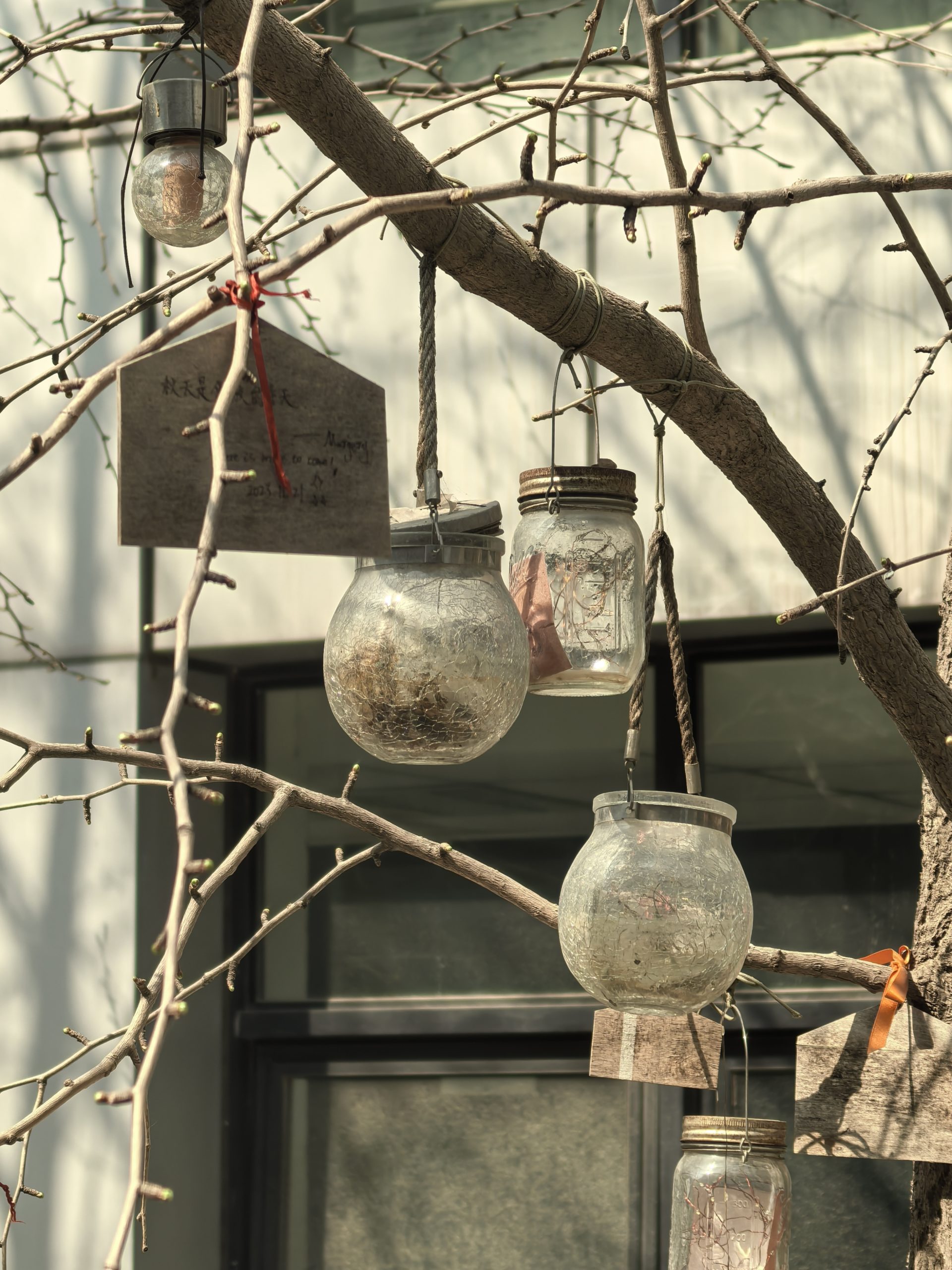 很旧的玻璃罐子,看起来平平无奇,上面有一些不知道是工艺还是裂痕的纹路,里面似乎有东西,可能写着谁许下的愿望吧。
